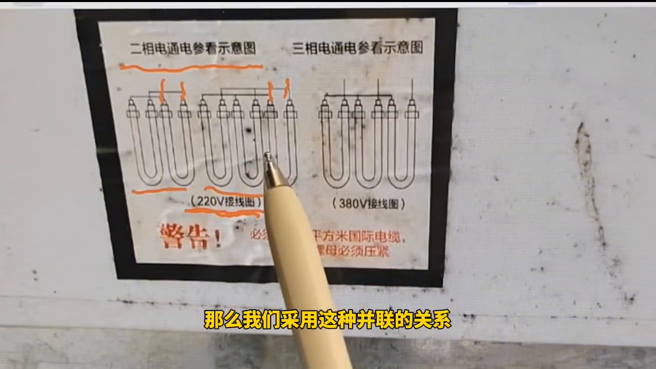 到底是怎么回事?具体看一下这张图。先来看它的接线示意图,这里写的两相电通电,参看示意图,下面写的是220伏的接线图。再看具体的接线,这里画的是两根加热管的接线图,这两根加热管是并联的关系,就是电源线。这边画的是三根加热管的接线图,三根加热管也是并联的关系,这里两根线是电源线。