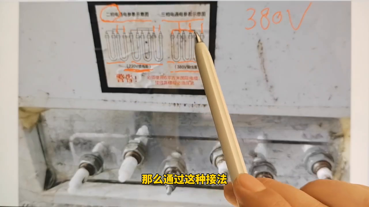 继续看这边这张图来印证一下,三相电源通电,参看示意图,这是三根加热管,写的是380伏的接线图,这三根加热管这里是短接了起来的,那么它就是一个星形的接法,这是它的三相电源。