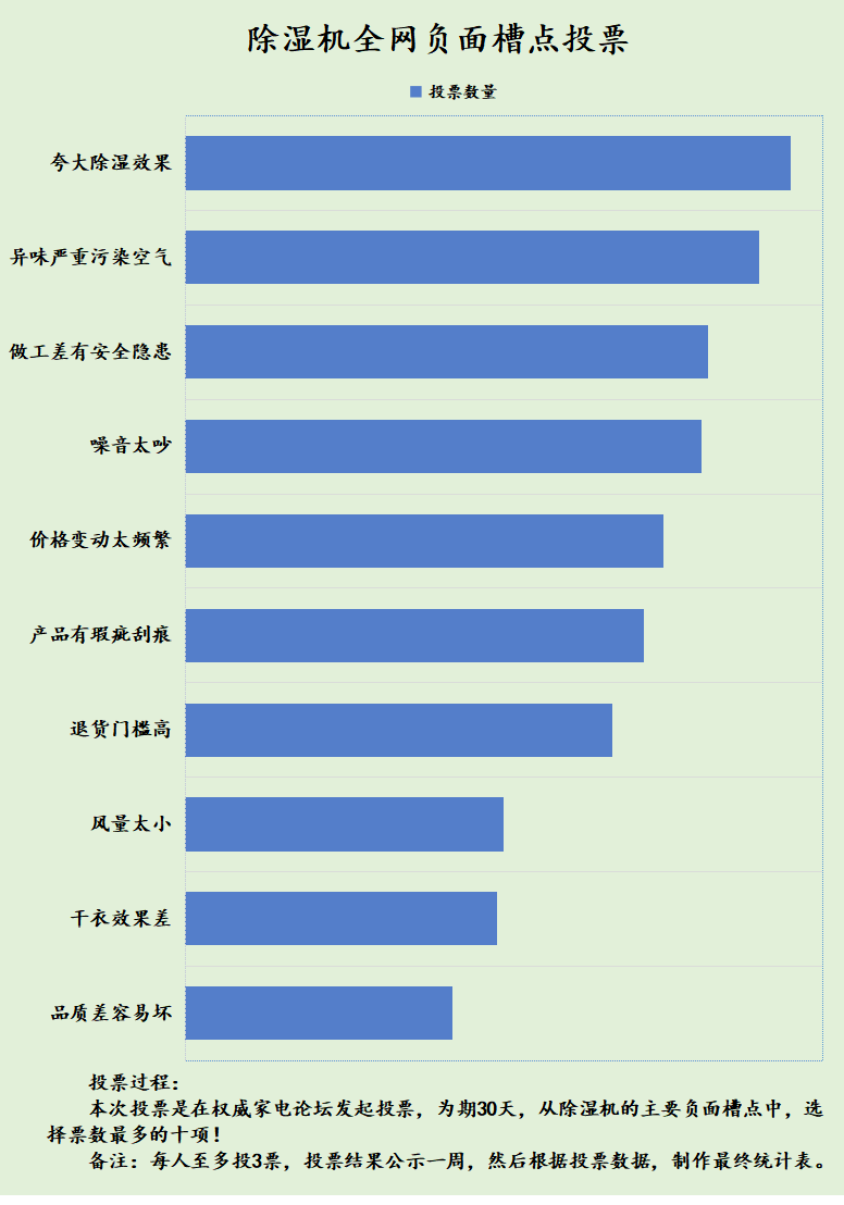 以下图表展示了除湿机行业内权威检测机构整理的除湿机十大负面评价,其中关于“夸大除湿效果”的投诉占比最高。同时,“异味严重污染空气”和“做工差存在安全隐患”也位列前三。基于这份图表,我为大家总结了除湿机的五大潜在危害,旨在帮助大家更加明智地选择和使用除湿机,避免不必要的困扰。