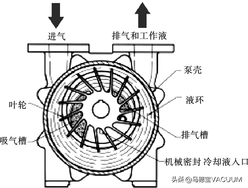 叶轮旋转,气腔在泵的吸气区的体积逐渐增大,其内部压力下降,从而将气体吸入泵内,相反,气腔在排气区的体积逐渐变小,其内部压力上升,从而将气体排出。