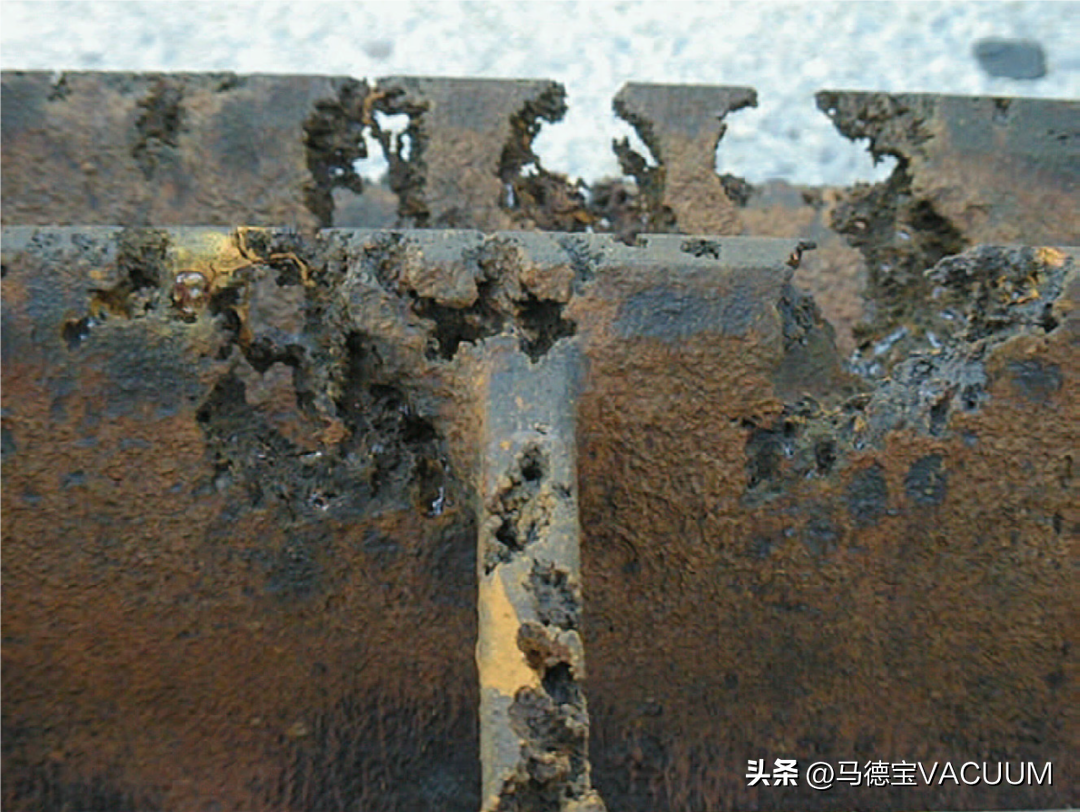 同时,液环泵在低的入口压力下会产生汽蚀现象。造成汽蚀的原因是:当泵的入口压力低于密封液的蒸汽压时,密封液迅速沸腾,并产生大量气泡,在气泡上升、破裂过程中会产生很大的冲击力,并从表面剥离少量金属,如果这种汽蚀持续时间很长,就会对泵造成严重损害,见图4所示。
