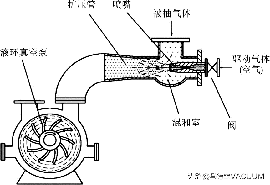 大气喷射器液环泵机组主要在较低工作压力或密封液温度较高情况下工作。喷射器吸入的气体可以是空气,亦可以用液环泵排出的气体作为大气喷射器的驱动气体。