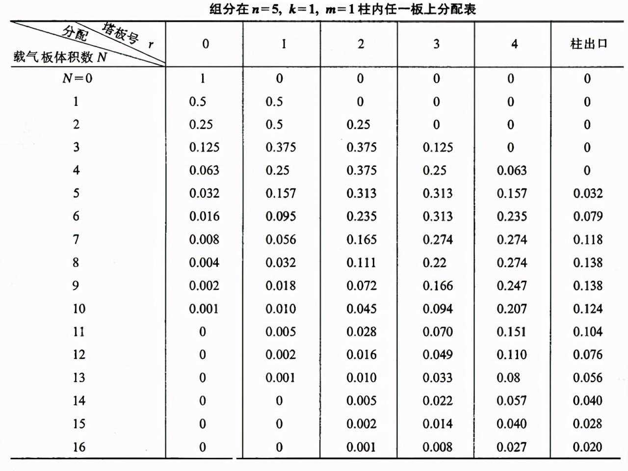 ▪开始时,若有单位质量,即m=1(例1mg或1μg)的某组分加到第0号塔板上,分配平衡后,由于k=1,即ns=nm故nm=ns=0.5。