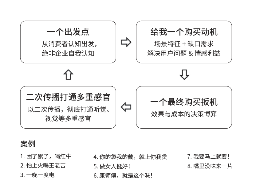 看看那些特别会兜售“理由”的品牌——怕上火喝王老吉;送礼只送脑白金;白加黑治感冒,白天不瞌睡,晚上睡得香;困了累了,喝红牛……总之,都是为了解决用户问题、满足需求缺口而存在的。