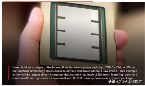 这是通过先进的封装完成的,其中台积电支持硅基插入器和硅基扇出型封装集成,它还拥有将芯片堆叠在晶片上,或将晶片堆叠在其他晶片之上的技术。台积电展示了一个接近2500平方米的世界上最大的硅中介层,其上放置了2个600平方米的处理器和8个75平方米的HBM内存芯片,这使得基于插入器的封装上有1800平方米的计算和内存硅,远远超过传统的网格大小限制的两倍。