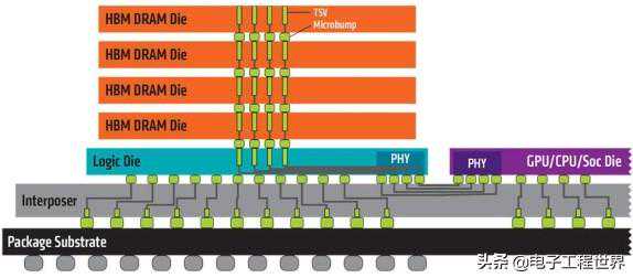 尽管这些HBM堆栈没有以物理方式与CPU或GPU集成,但通过中介层紧凑而快速地连接后,HBM具备的特性几乎和芯片集成的RAM一样。