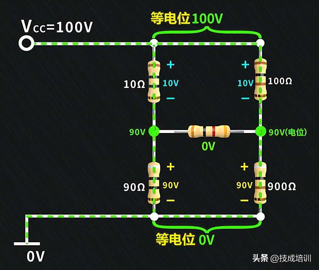 这90V的电位怎么来的?简单解释一下。我们都知道,电压就是电位差,即任意两点间的电压,就等于该两点的电位相减。例如图三中,上一排电阻的10V电压,其实是由这排电阻的上端电位减去下端电位得出,而上端电位是100V,所以下端电位就是90V,才有电位相减100V-90V=10V电压。同理,大家也可以尝试从下一排电阻的电压90V出发,分析出中间点的电位是90V。