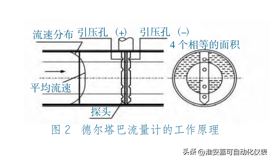 德尔塔巴流量计是基于差压式流量计的工作原理,通过特殊探头插入管道内,该探头前后两段有分布不均匀的取压孔,并通过二次仪表对两端的取压孔进行测量并计算得到前后段的压力平均值,根据流体的流量特性,在管道内流体的速度分布是接近于管道外径流速越慢,接近于管道中心流速越快,基于此情况形成差压,并通过二次仪表显示,直接计算管道内流体的流量。