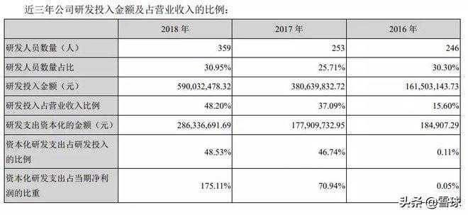 2018年公司研发人员数量达359人,同比增长41.90%,占公司总员工数30.95%;研发投入占营收比重增加至48.20%,同比增长55.02%;资本化研发投入占研发投入比例达48.53%。