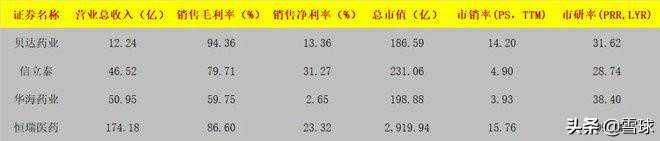 从营业收入上看,几家公司的营收收入相对恒瑞医药来说规模差距都比较大,其中贝达药业的规模最小,具备较大的成长空间。而从盈利能力的角度出发,由于贝达药业的产品主要以创新药为主,所以贝达药业在行内体现出更高的毛利率水平,但由于其研发投入金额较大,从而导致销售净利率较低,同时华海药业则由于销售费用过高,从而导致公司销售净利率在行内呈现较低水平。估值方面,由于贝达与恒瑞具备较强的创新药基因,从而令两家公司相对信立泰与华海药业的仿制药公司具备更高的市销率;此外在市研率方面,由于三家公司前期股价皆出现整理修复,加上其研发支出彰显逐年递增,此刻三家公司在市研率方面相对恒瑞医药呈现出低估值的现象。