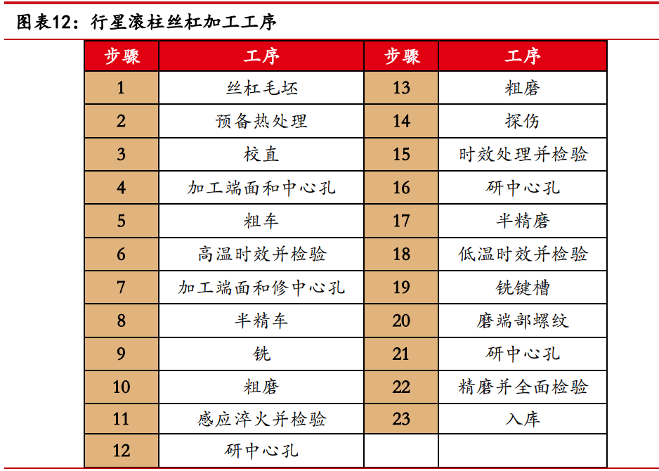 梯形丝杠的加工工艺原本主要采用车削加工,工艺路线为:冷拔→滚花→车螺纹→校正→钻孔→切断→倒角,整体技术简单,工艺路线成熟,但效率较低、成本较高,且由于材料刚度低,车削、滚花时易变形,小号螺轮无法生产。目前多使用旋风铣削工艺代替车削工艺,将铣丝、滚花一次性完成,工艺路线变为冷拔→滚花、铣丝→校正→钻孔、切断→倒角,改进后减少了由切削力引起的振动,表面粗糙度也减小了。滚柱丝杠性能更优、使用寿命长、体积小,但加工工艺壁垒较高,市场空间有待成长。行星滚柱丝杠是将旋转运动转化为直线运动,传动单元为丝杠及螺母之间的滚柱,与滚珠丝杠的主要区别是负载的传递单元使用螺纹滚柱而不是滚珠。区别于滚珠丝杠:1)行星滚柱丝杠由于高数量的接触点,能够承受更高的静态负载和动态负载,静载为滚珠丝杠的3倍,寿命为滚珠丝杠的15倍;2)大量的接触点和接触点的几何结构使行星丝杠比滚珠丝杠具有更强的刚度和抗冲击能力,同时也可以提供更高的转速及更大的加速度;3)行星滚柱丝杠为螺纹传动,螺距设计范围更广,行星滚柱丝杠的导程可以设计的比滚珠丝杠更小。总的来说,行星滚柱丝杠与滚珠丝杠结构近似,在将传力元件替换为螺纹滚柱之后,其在传动平稳性、负载能力、转速及加速度、寿命等性能方面更具备优势。