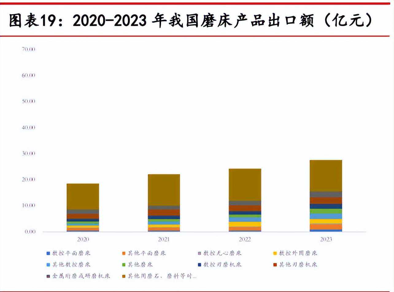 我国磨床进出口贸易逆差呈现逐年缩小态势,但总体进出口价值量差距仍较大。根据中国海关总署统计数据,中国磨床进口额从2020年的58.42亿元下降至2023年的55.87亿元,同时中国磨床出口额从2020年的18.54亿元上升至2023年的27.66亿元,期间贸易逆差缩小了11.67亿元。可以看出,我国原本高度依赖国外数控磨床产品,目前国产替代进程已经在提速中,未来将会从各个核心部件自给能力上逐个突破。《中国制造2025》也明确提出“到2025年,70%的核心基础零部件、关键基础材料实现自主保障;加快高档数控机床、增材制造等前沿技术和装备的研发;组织实施高档数控机床等一批创新和产业化专项、重大工程”。