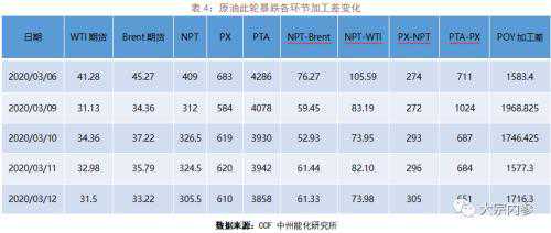 3.9日数据受涨跌停板限制,不作为依据。按3.12日数据,Brent原油每下跌1美元,PX加工差增长3.5美元,PTA加工差收窄33元,POY加工差滞后增长139元。