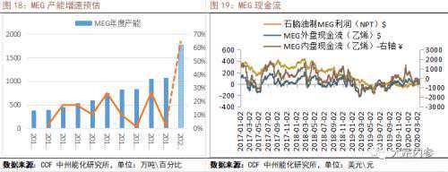 和PTA类似的是,MEG也处于产能投放周期中,且投产力度比PTA更强。产能增速将达到60%以上。2017-2018年是乙二醇产能大幅扩张的一年,也是从2018年开始,MEG的现金流就一直被压缩在0值附近。