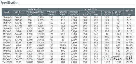 上图是某行走马达的参数表,最后面这一列就是挖掘机的吨位,看到这个就一目了然了。从上图我们也可以看出,减速比都是比较大的,最小的也有45.97。