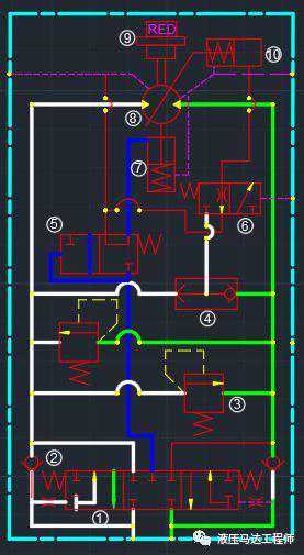 我们来看这个原理图,我们先来介绍下这些阀的名称及功能,1是平衡阀,实际是一个换向阀,由于能够在油压的作用下自我调节,所以也叫平衡阀。2是单向阀,防止液压油倒流,3是溢流阀,起缓冲功能,当压力大的时候,溢流阀打开,将高压泄掉,保持系统压力不变。4是梭阀,梭阀是一个逻辑选择阀,无论哪个油口进油,都有通向马达的双速控制阀。5是制动控制阀,6是双速控制阀,7是制动器,8是马达,9是减速机,10是双速控制油缸。