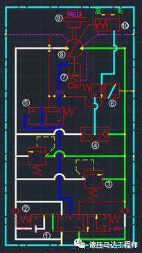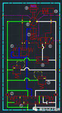 这个点画线框里的就是我们行走马达的整个原理图,这些合在一起叫做行走马达。其中8是马达,行走都靠这个,其他的都是控制阀,来实现不同的功能。