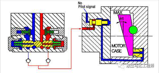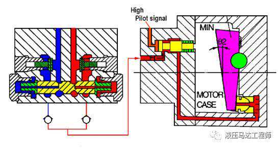 可以看到低速时的斜盘角度大,此时排量大,速度低。高速时,斜盘角度小,此时排量小,速度高。
