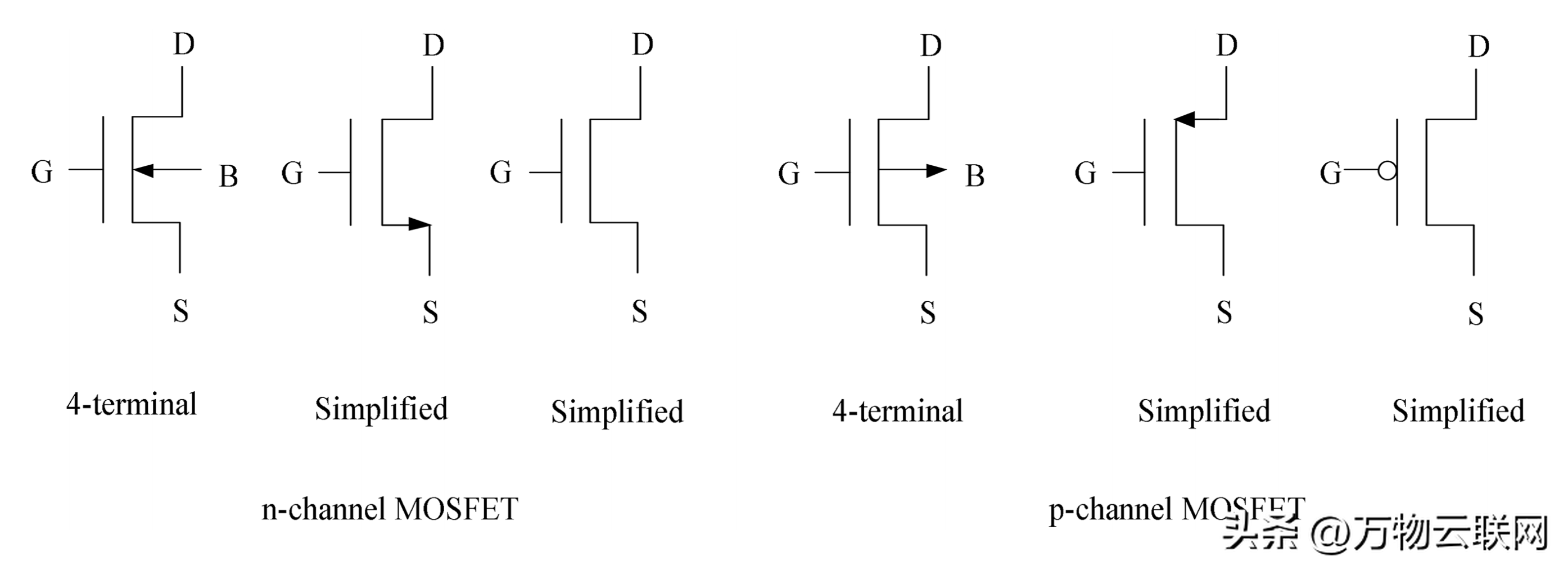 图3,n沟道和p沟道增强型金属氧化物半导体场效应晶体管(MOSFET)的电路符号。