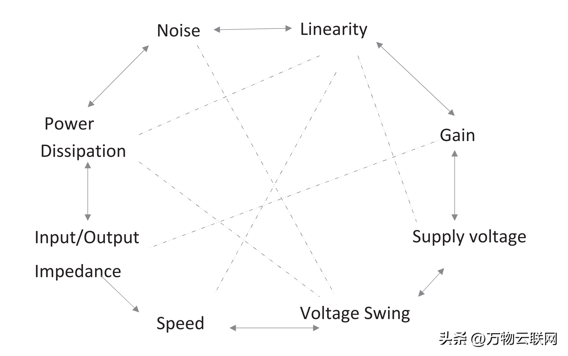 泄漏功率和传播延迟是采用深亚微米技术设计数字CMOS超大规模集成(VLSI)电路时面临的两个主要挑战。而对于模拟CMOS,电压摆幅、噪声和频率性能是三个主要挑战。了解器件行为非常重要,例如,最小栅极长度将提供最高速度,从而减少传播延迟。而对于模拟CMOS,栅极长度至少为最小栅极长度的两倍将实现噪声、增益和速度的最佳权衡。图5显示了一种权衡思路。因此,对于混合信号集成电路,利用不同的栅极长度以获得最佳性能。