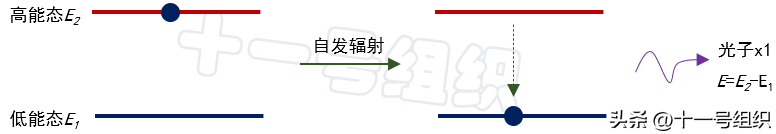 原子中处于高能态的电子,在没有任何外界光子作用下,有一定概率会自发地从高能态向低能态跃迁,损失的能量会以光子的形式辐射出来,这个过程称之为自发辐射,如图2所示。