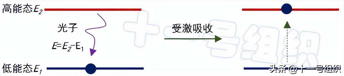 原子中处于低能态的电子,也不是吃素的,随时在观察身边是不是有外来光子经过,一旦有能量恰好等于两个能级之间能量差(E2-E1)的光子出现时,就会启动“吸星大法”,将光子的能量吸收过来,用来将自己提升到高能态,这一过程称为受激吸收,如图3所示。