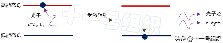 原子中处于高能态的电子,在见到上述外来光子时,也不会无动于衷,并且在辐射场能量够大后,自己将向低能态跃迁并辐射出一个和外来光子具有相同频率、相位、偏振方向及传播方向的光子,听起来有点像私奔,这个过程称之为受激辐射,如图4所示。