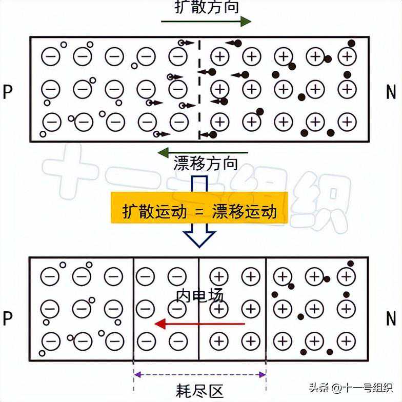 当扩散运动和漂移运动所迁移的载流子数目相同时,达到动态平衡,就形成一个PN结。PN结中载流子数量非常少的一个高电阻区域称为耗尽区。