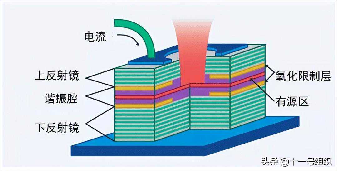 有源层通常由3~5个量子阱(一种薄层结构,可以在垂直于薄层表面的方向上限制粒子)组成。有源区的两侧是氧化限制层,一方面起着限制载流子的作用,另一方面起着调节谐振腔长度的作用,使其谐振波长正好是所需要的激光波长。