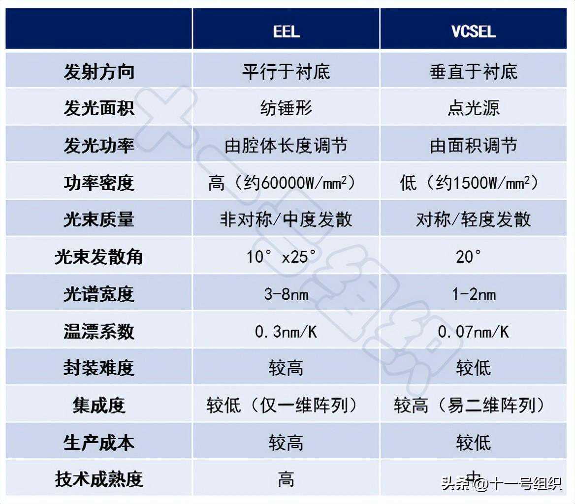 EEL和VCSEL的主要性能差异体现在功率密度、温漂系数、光束质量、光谱宽度和生产成本等方面,汇总如表1所示。