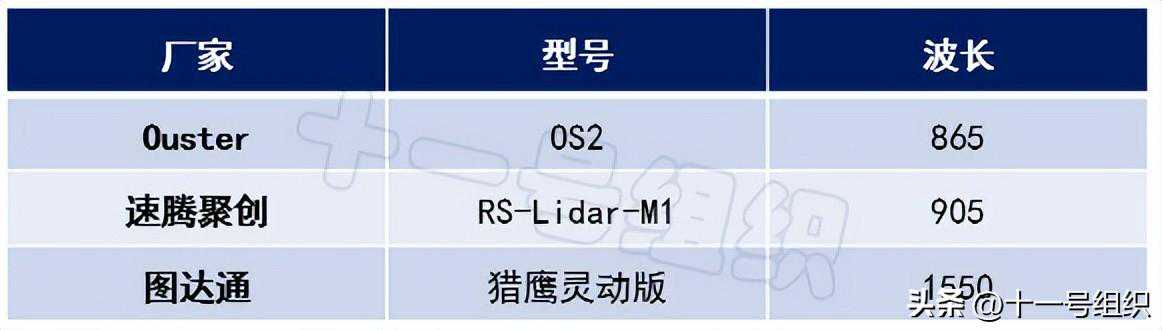 任何一种光都有波长,激光也不例外,激光雷达最常使用的波长为905nm和1550nm,主流激光雷达波长如表2所示。