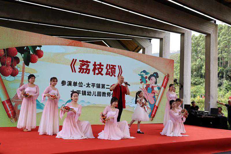 现场的观众们还欣赏了由太平镇第二中心小学、太平镇幼儿园教师代表表演的节目《荔枝颂》。随后,主持人宣布太平镇荔日嘉年华企业助农认购荔枝仪式正式开始。在区委区政府和太平镇党委、政府的领导下,太平荔枝产业的发展得到了广大企业的大力支持,本次活动共有广州市顺兴石场有限公司、8号仓流溪河奥莱小镇、广东珠江投资控股集团有限公司、广州明基新型墙体砖厂、广州市东浦混凝土有限公司、广州弘毅福物业管理有限公司、广州嘉城工程管理有限公司、从化恒志聚氨酯制品厂、广州荔福园餐饮有限公司、广州发展电力集团十个企业参与认购项目,各个代表上到台前,一对一开展助农认购荔枝环节。