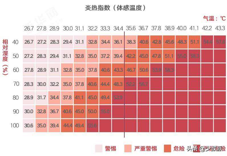 湿度对体感温度的影响,可以简单归结为让冷更冷、热更热,冬天的低温前面已经说了,夏天的话——美国国家海洋和大气管理局(NOAA)综合考虑了温度和湿度对人体感温度的影响,提出的一个炎热指数: