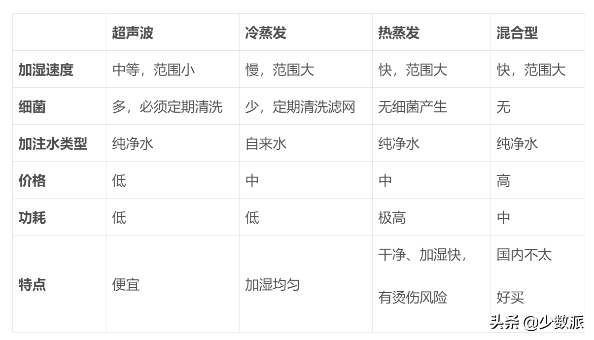 四种加湿类型介绍那么接下来就看看这四种类型加湿器的特点吧,先上对比表格: