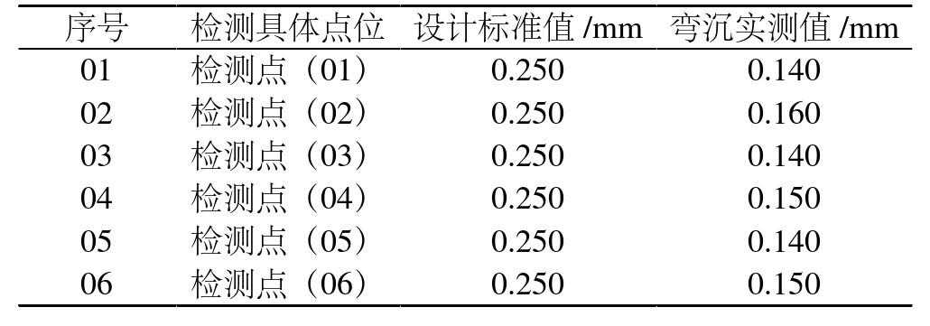 4施工质量检测4.1路面弯沉值路面弯沉值是评价沥青路面施工质量的重要指标,直接反映路面承载性能。该工程路面弯沉检测采用贝克曼梁法进行检测,选取6个测点,各测点弯沉值取多次检测平均值,具体检测数据如表1所示。