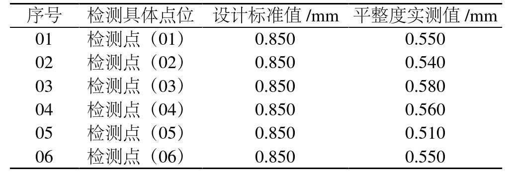 4.2路面平整度该工程沥青路面平整度检测采用水平激光仪进行检测。实际检测时,随机选取6个测点,各测点平整度取多次检测平均值,具体检测数据如表2所示。
