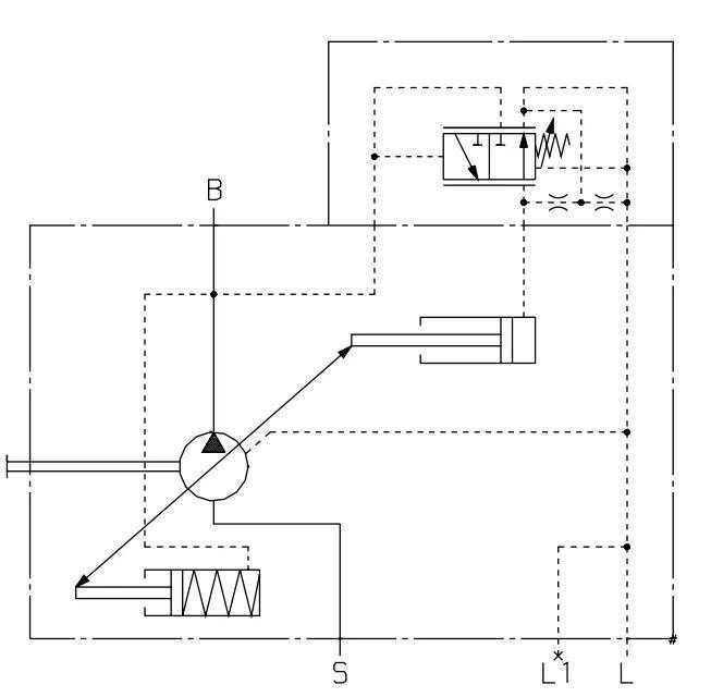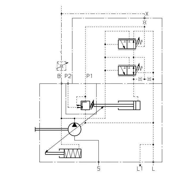 DRT1/2原理:以控制压力来控制的可变式压力控制器,无控制压力时,泵处于准备状态(约25bar)。使用控制压力油泵压力按照DRT1或DRT2系数比(DRT1i=18.2,DRT2i=12.4)升高。此控制是为压力需求控制所作的特别设计。压力需求控制适用于工程机械的工作装置的控制。在本系统中,主阀芯采用液控。泵的压力随先导压力而变化。