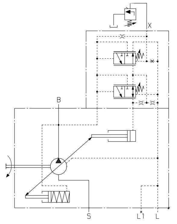DG原理:通过在X油口接通外部切换压力使变量泵达到最小摆角。控制油可直接供给控制活塞,所需的最低控制压力Pst≥30Bar。变量泵只在最大排量点或最小排量点切换。
