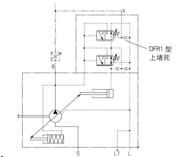 DFR/DFR1原理:除了压力控制器的功能外,泵的流量可通过执行原件上(如一个节流孔)的压差进行设定。在DFR1型上节流孔X堵死。