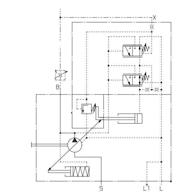 DFLR原理:在各种工作压力下,为了获得恒定的驱动扭矩,轴向柱塞泵的摆角及流量也随之改变。从而达到压力与流量的积维持在一个恒定值。