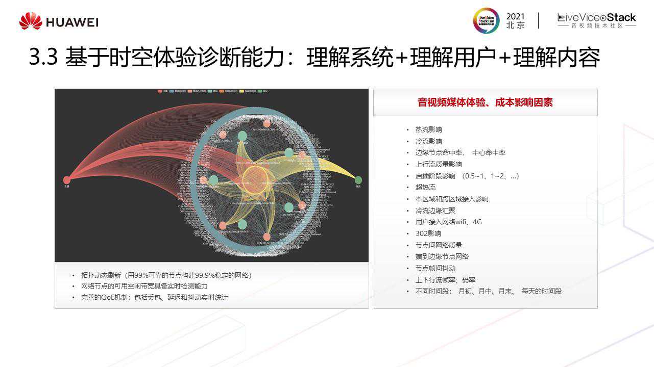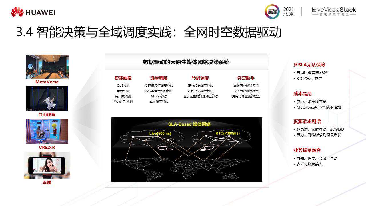 接下来介绍在体验提升方面的一些实践,实践包括业务层的全域调度及传输层的全链路加速。现网存在的很多问题是无法使用单一方法解决,这里有四个问题:多SLA保障问题,成本高昂问题、资源诉求剧增、业务场景融合,这些问题往往都是多业务,多目标的综合性问题,需要一个数据驱动的云原生媒体网络决策系统来解决,决策系统需要具备的核心能力是智能画像(能够进行QoS预测、带宽预测、用户数预测、算力消耗预测),流量调度、算力调度、商业助手(因为所有业务都跑在一张网络上,涉及到资源复用,需要知道下一位用户第二天的复用情况。需要从回源率、成本、复用比三个维度进行预测)。