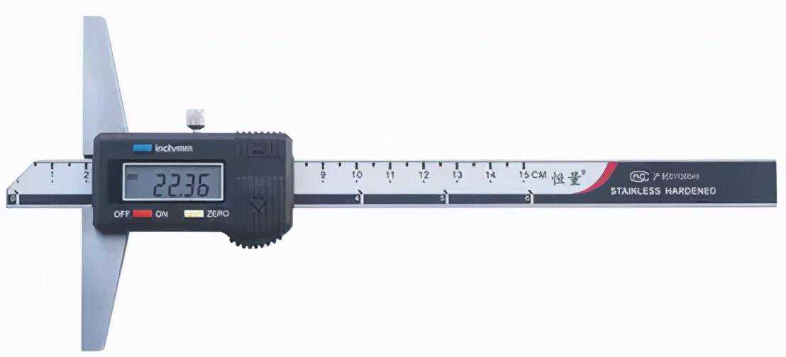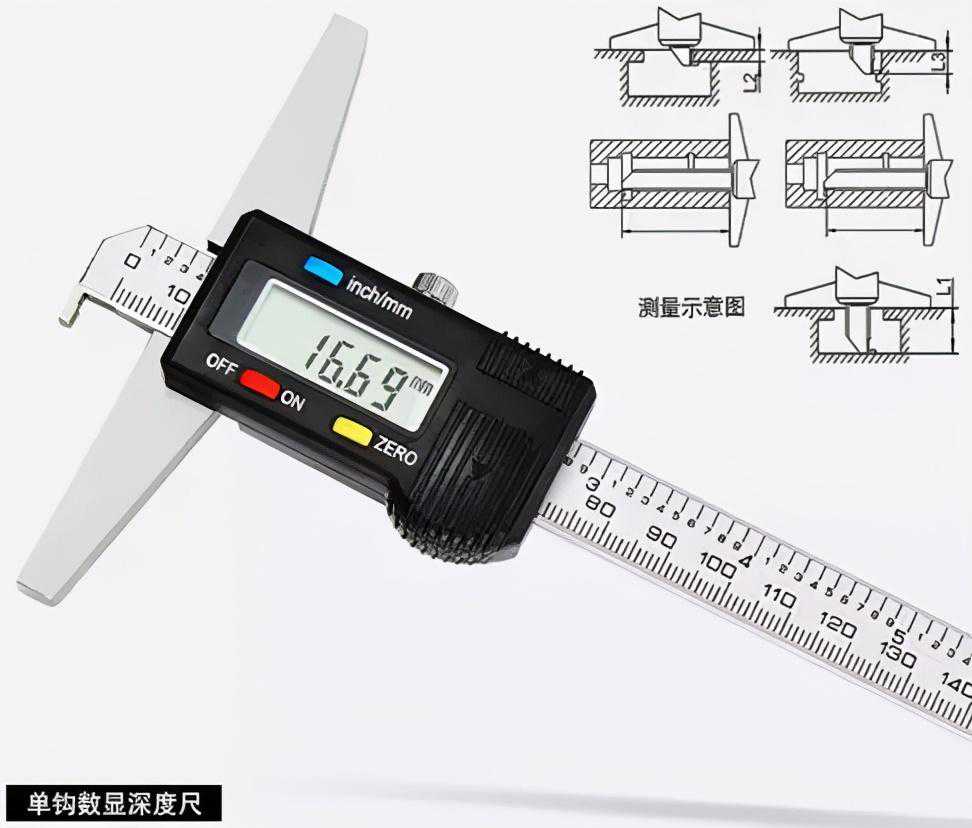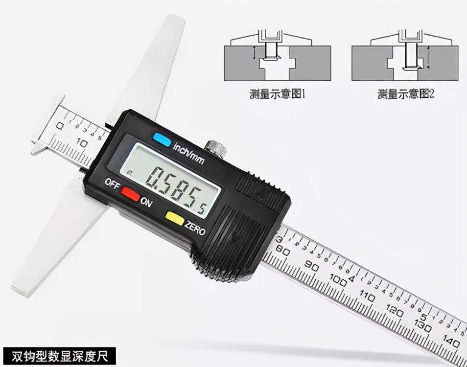 深度游标卡尺用于测量凹槽或孔的深度、梯形工件的梯层高度、长度等尺寸,通常被简称为“深度尺”。如测量内孔深度时应把基座的端面紧靠在被测孔的端面上,使尺身与被测孔的中心线平行,伸入尺身,则尺身端面至基座端面之间的距离,就是被测零件的深度尺寸。读数方法和游标卡尺完全一样。