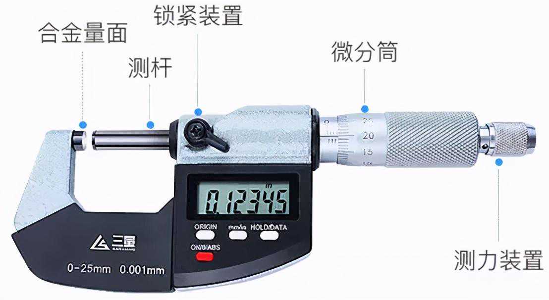 螺旋测微器又称千分尺、螺旋测微仪、分厘卡,是比游标卡尺更精密的测量长度的工具,用它测长度可以准确到0.01mm,测量范围为几个厘米。它的一部分加工成螺距为0.5mm的螺纹,当它在固定套管B的螺套中转动时,将前进或后退,活动套管C和螺杆连成一体,其周边等分成50个分格。螺杆转动的整圈数由固定套管上间隔0.5mm的刻线去测量,不足一圈的部分由活动套管周边的刻线去测量,最终测量结果需要估读一位小数。结构如下