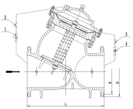 JD745X多功能水泵控制阀由主阀和调节阀及接管系统组成,阀体采用直流式阀体,主阀控制室为膜片式或活塞式的双控制室结构,控制室比一般水力控制阀增加了一个,增加了对主阀的控制功能,实现了对水泵出口的缓慢开启、全开、缓闭、截止等多功能控制,实现了一个阀门、一次调节对水泵出口的多功能控制。JD745X多功能水泵控制阀的接管系统采用调节阀控制,通过设定调节阀的开度,可方便实现需要的各项控制参数,如主阀的开启速度、缓闭速度等等。