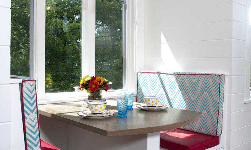 再看看这个轻松愉快的早餐角落。此外,设计师还增加了明亮、现代的坐垫,配以花卉和对比鲜明的餐具来完成整个造型。在这个小小的早餐角落里,平铺的拼接墙壁增添一份舒适、美丽的吸引力。
