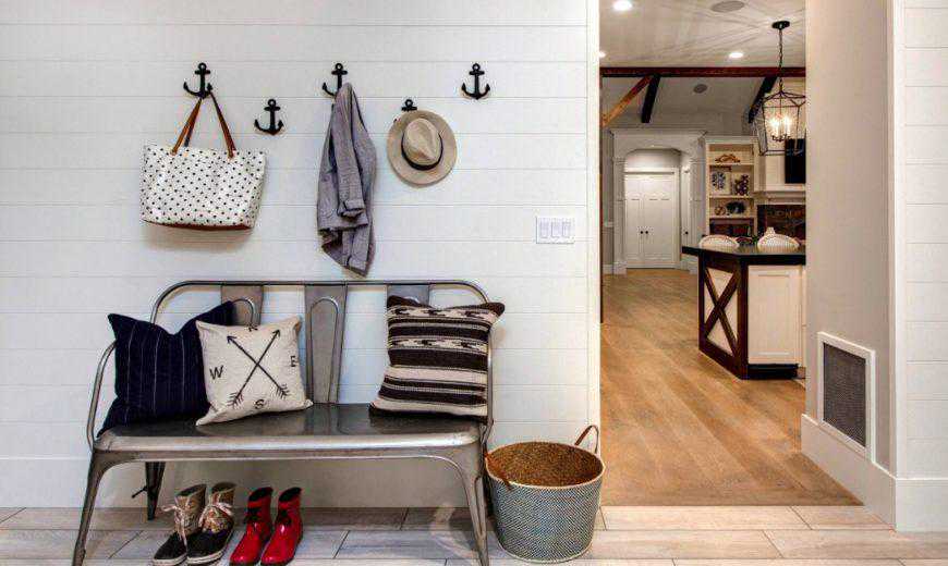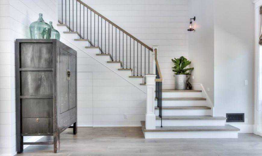 如果您曾经想过在将搭接板放入家中时必须保持严格统一的外观,请再考虑一下。如这张照片所示,楼梯一侧的墙距前门最远,上面铺满了传统的白色搭接板。但是,地板上的线条模仿了搭船的外观,并带有棕灰色的现代饰面。楼梯还包括白色和棕灰色。