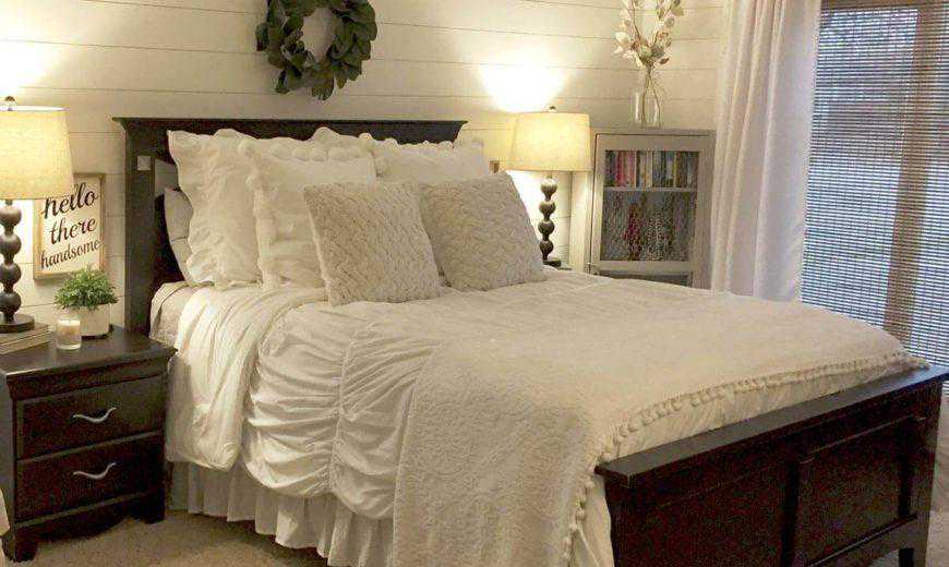 当人们想到拼接板墙时,他们通常会想到的只是厨房和浴室。但是,拼接板墙可以为几乎任何房间(包括卧室)增加完美的画龙点睛的效果!此处的照片显示了白色的搭接墙壁如何为带有精美深色深色红木家具的卧室带来恰到好处的亮度对比效果。