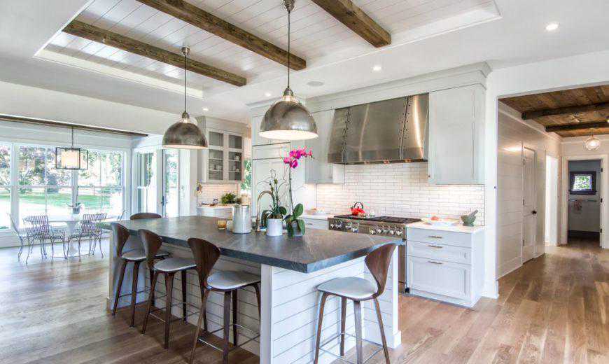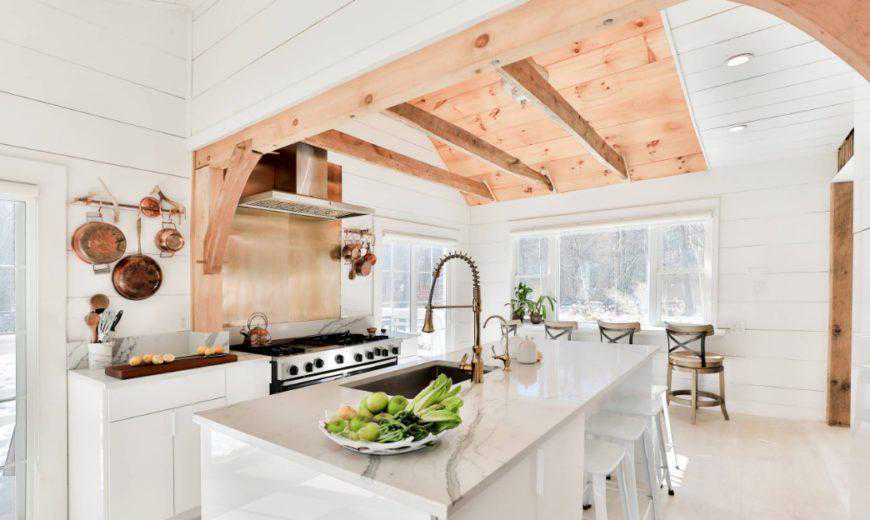 拼接板墙设计非常适合大型,开放,通风的空间,例如下面的空间。这间客房的地板更现代,更整洁,并在其他地方(例如天花板和岛台)采用传统的白色搭接设计。炉子后面的防溅板上的地铁砖模仿了木质搭接板的外观,但是当准备一顿完美的饭菜时很容易清洁。