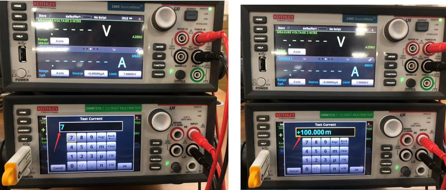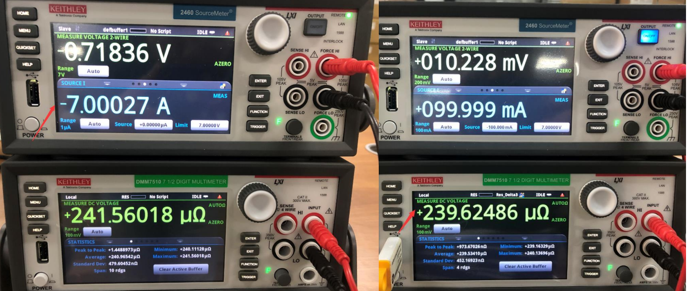 本次测试仪器是吉时利的2460源表和DMM7510万用表,测试原理是2460源表输出4次7A或者100mA的正反电流,DMM7510测试电压,算出4次的绝对值后的平均值。
