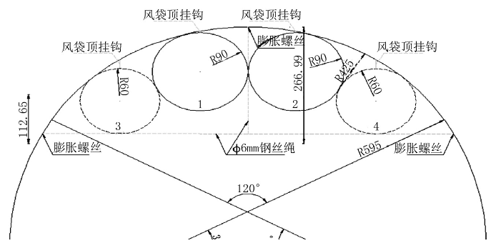 2.2交叉口风带布置由于导洞进入主洞后4条风带,其中两条1.8m直径风袋往大里程送风,剩余两个1.2m风带为小里程送风,进入正洞后存在转弯交叉布置情况,为便于叙述对每条风袋编号为1、2、3、4,具体见图2风袋编号。